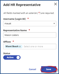 In the Add HR Representative window, select a Username (Login ID) from the existing Agency users in the dropdown. Enter the Representative Name. Select one or more Offices to assign to the HR Representative. Click the Status sliding button to mark the HR Representative as Active. Click Save.
