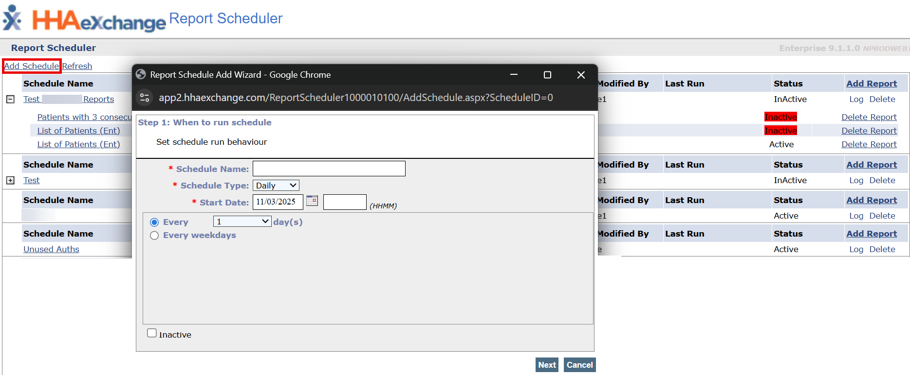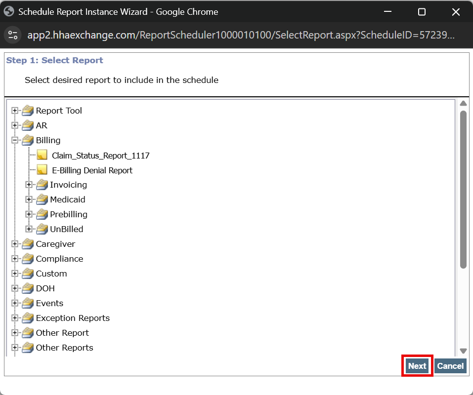 Select the report from the Schedule Report window, and then select Next.