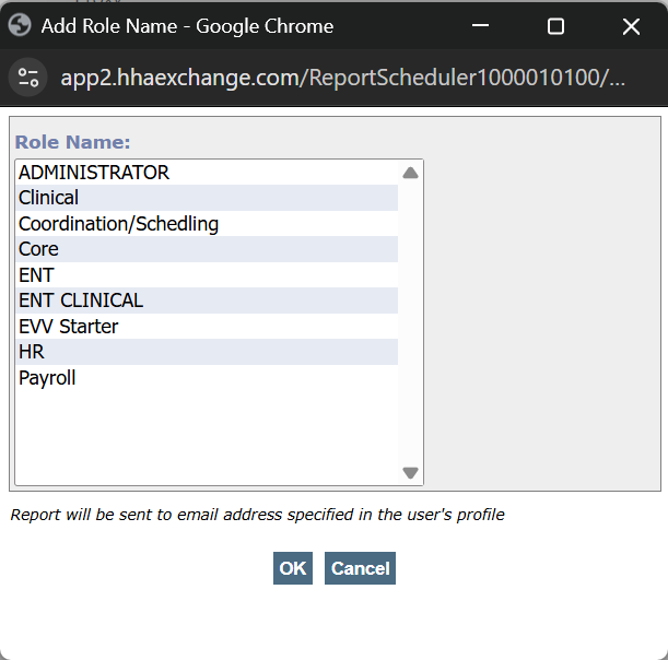 Role sends the report to anyone in the selected role - Select a role from the Role Name field, and then select Ok.