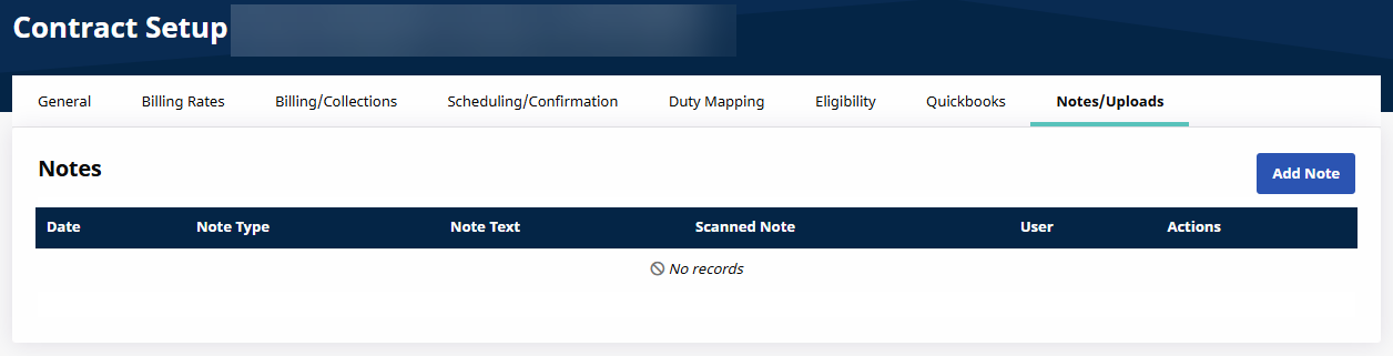 Any additional information or scanned documentation pertaining to the Contract may be stored on the Notes/Uploads tab of the Contract Setup page. Before any notes can be added, values for the Note Type must be set up on the Reference Table.