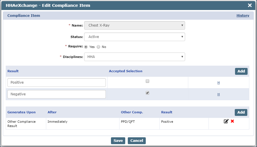 Back on the Edit Compliance Item window, remove the existing Generate Upon condition for the PPD and QuantiFERON Medicals by selecting the red X in the Generate Upon table.