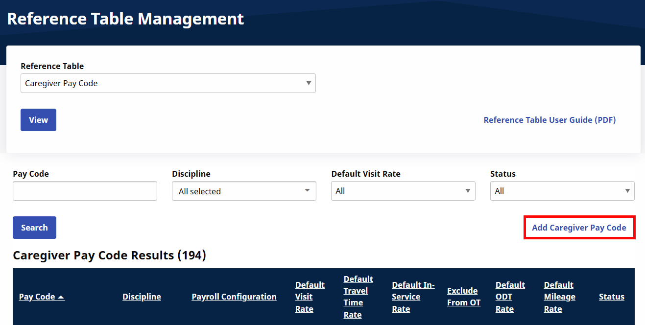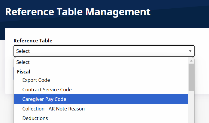 In the Reference Table field, select Caregiver Pay Code under the Fiscal header and click View.