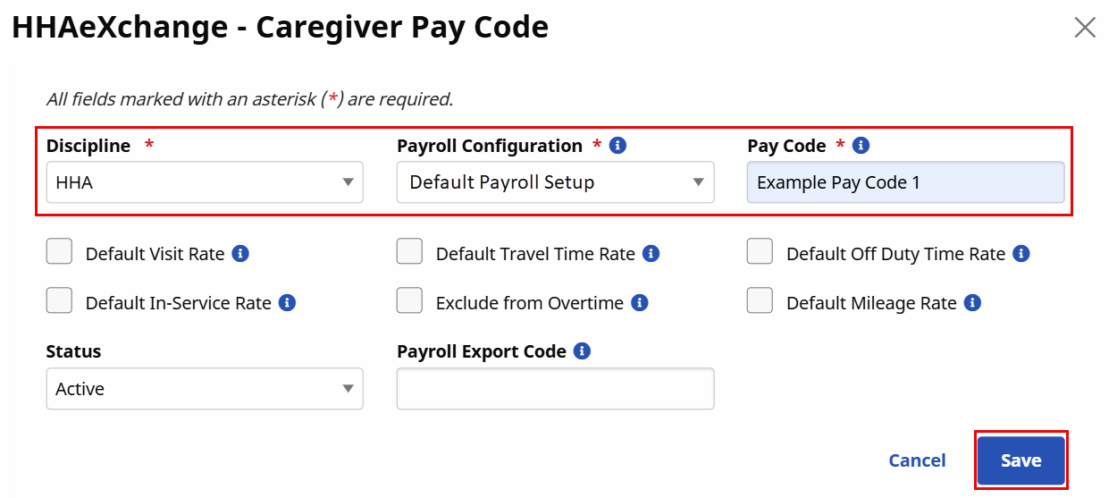 The Caregiver Pay Code window opens. Complete the required fields (marked with a red asterisk) to include Discipline, Payroll Configuration, and Pay Code. Click Save. See the table below for a description of each field.