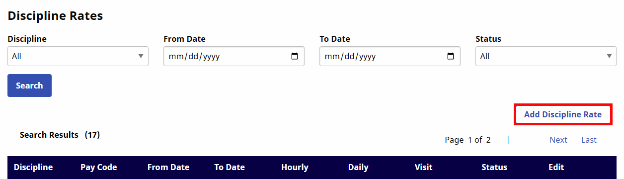 The Discipline Rates window opens. Complete the required fields (denoted with red asterisk) to include Discipline, PayCode, From/To Date, Hourly, Daily, and Visit. Click Save.