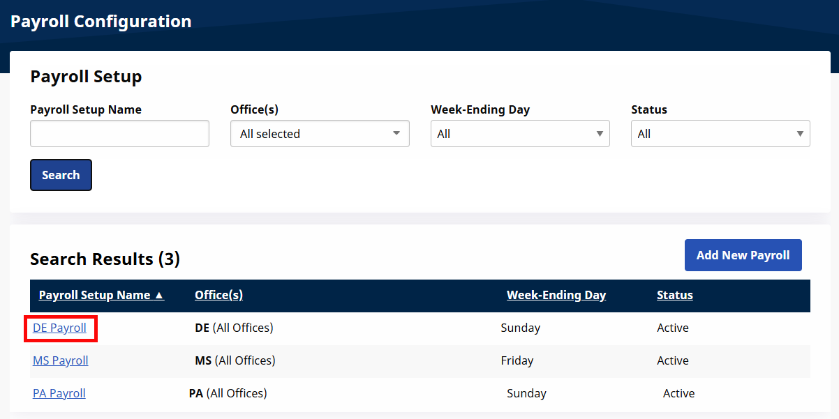 From the search results, click the applicable Payroll Setup Name.