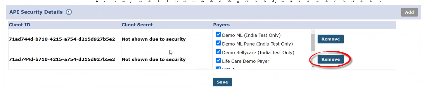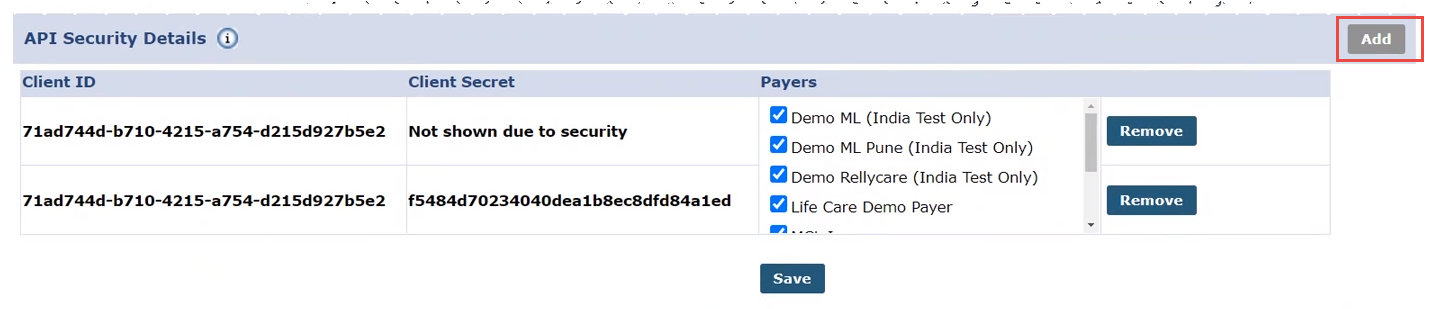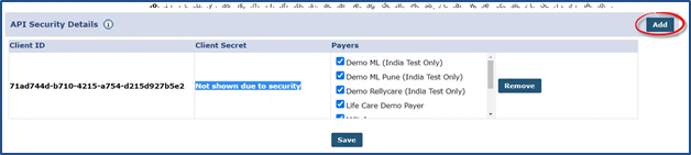 When returning to the API Security Details section, the Client Secret code is replaced with a security message (Not shown due to security). To add another set of credentials, click the Add button. There is a limit of 2 sets of credentials at a time.
