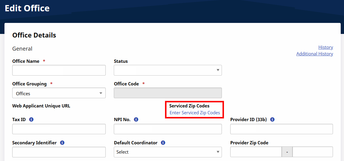 To set your Serviced Zip Codes, click the Enter Serviced Zip Codes link to open the Office - Serviced Zip Codes window. Use the Edit Office window to add, edit, or delete zip codes, using the Add button or corresponding Edit and Delete icons per Zip Code.