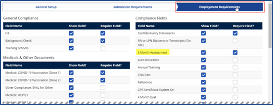 In the Employment Requirements tab, select and configure employment requirement fields which may focus on specific qualifications for employment as a Caregiver (for example, a 3-Month Assessment).