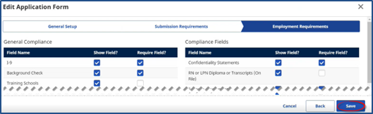 Repeat the steps above to select fields in the Employment Requirements tab. Click Save to finalize.