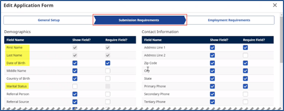 In the Submission Requirements tab, select and configure application fields for Applicants to submit in the initial round of the onboarding process. Basic information including First Name, Last Name, Date of Birth, and Marital Status.