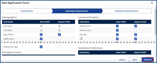 Complete the steps in the table to configure both Submission and Employment Requirements fields.