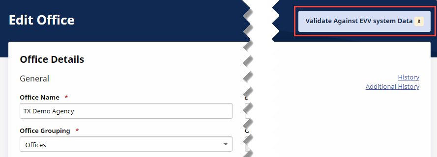 To manage information to meet state requirements, click Validate Against EVV system Data at right of the Edit Office page under Admin > Office Setup > Search Office > find and select the office.