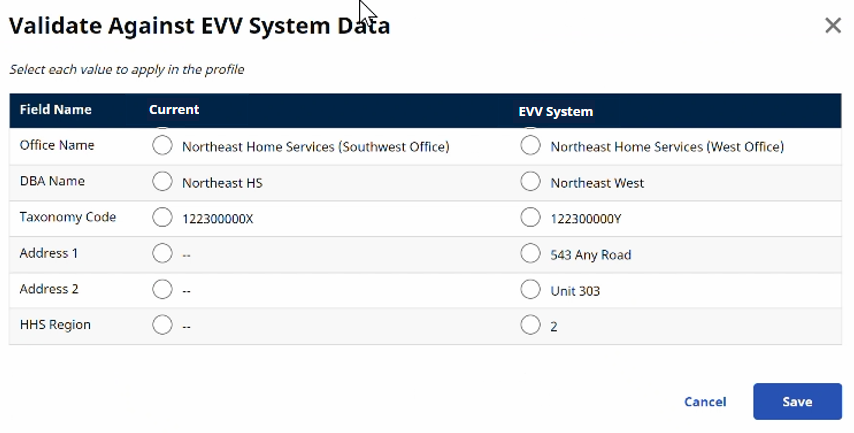 On the Validate Against EVV System Data page, select to either keep the Current data (in the left column) or select to keep the EVV System data (in the right column), retrieved from the EVV Master Data System.