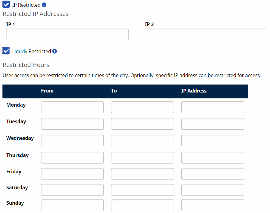 | Hourly Restricted | Specify the days and hours when Users may access the system. A valid IP address for each day of the week can also be added. |