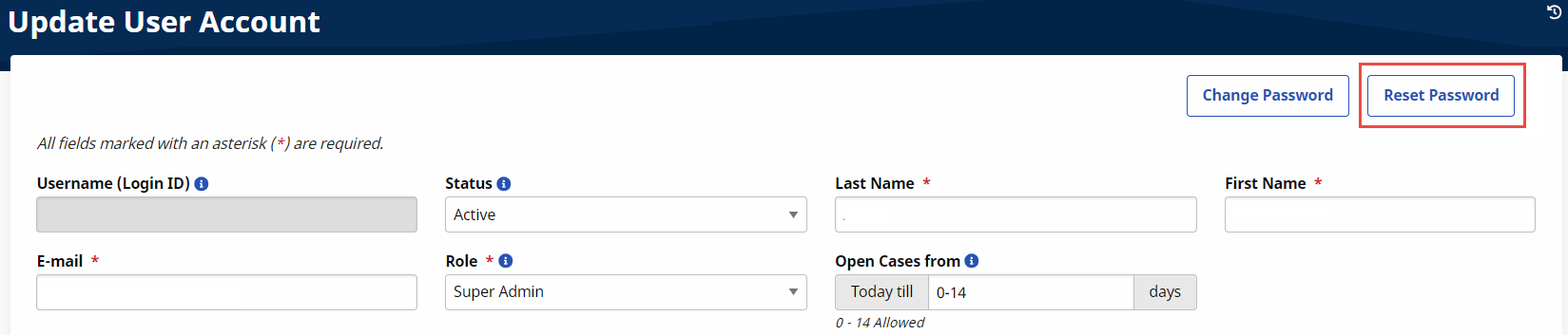 A Password Reset can be initiated via the User Account page under Admin > User Management > User Search. On the Update User Account page, click the Reset Password link.