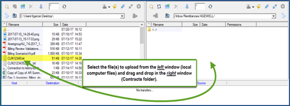 Locate the saved 835 files that appear in the left window and drag them to the appropriate Contract folder on the right window. HHAeXchange only processes 835 files that are x12/txt format.