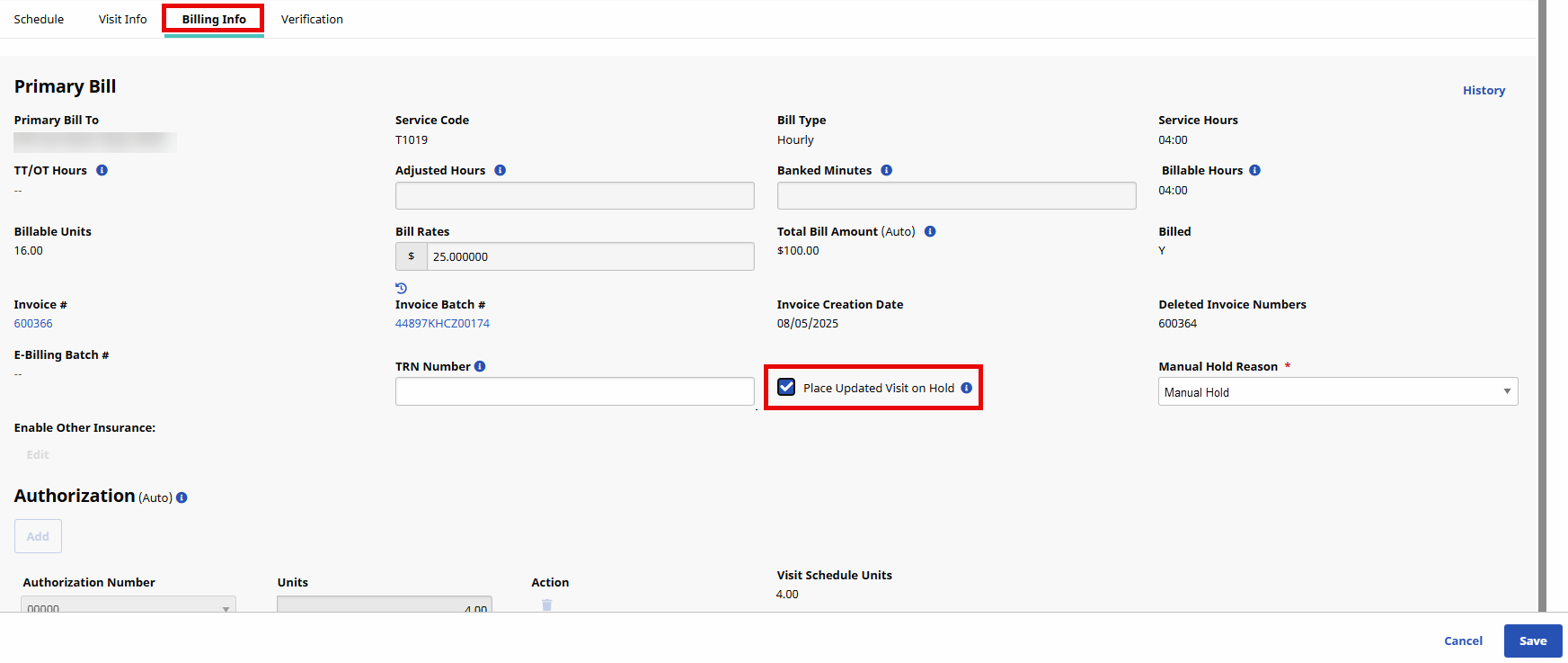 After the corrections are applied, deselect the Place Updated Visit on Hold checkbox and Save.