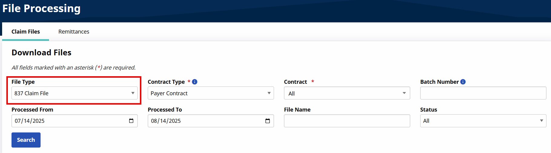 Select 837 Claim File in the File Type field, complete the required fields, and select the Search button.