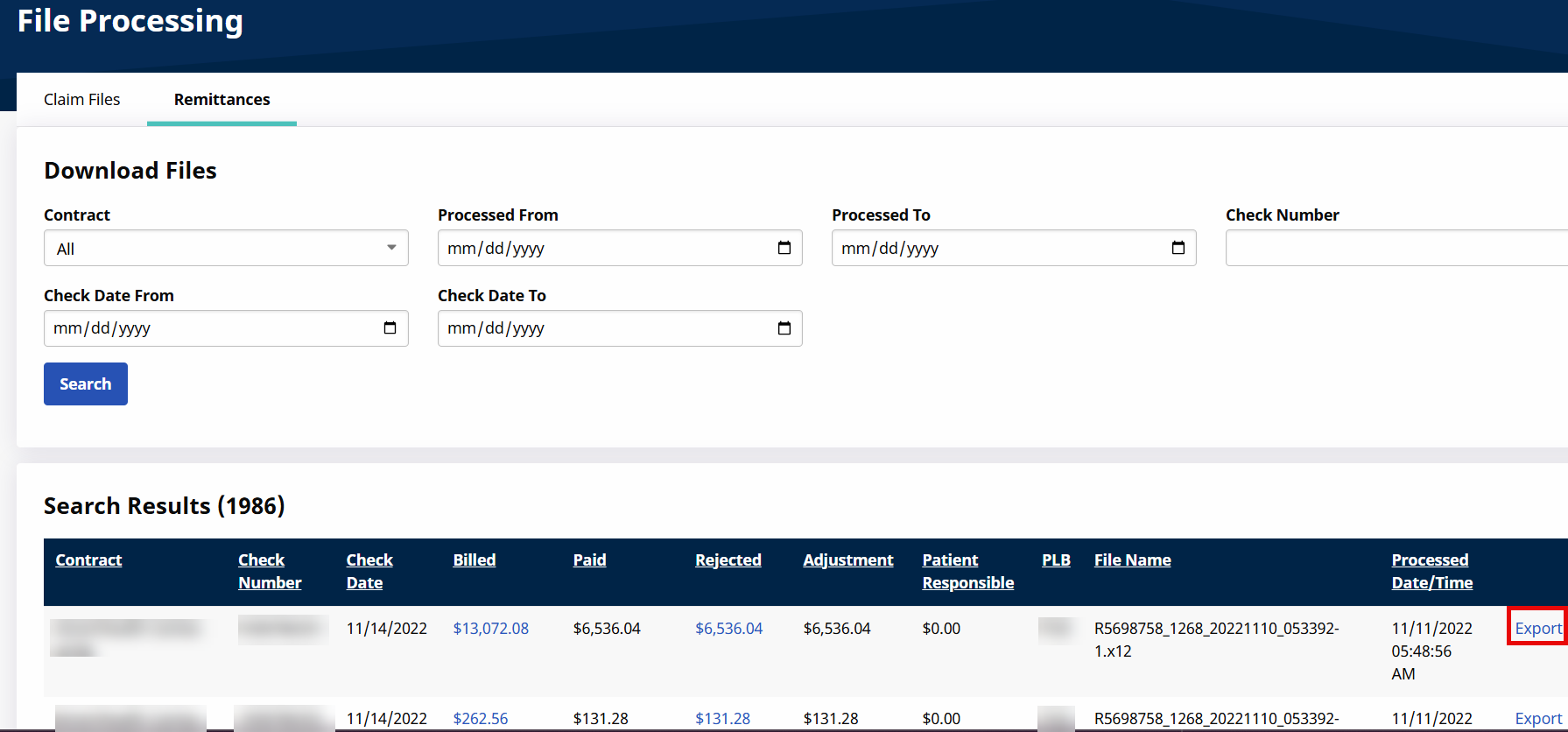 The search returns all 837 Claim files generated by the Agency. Click the Export link in the rightmost column to download the claim file.