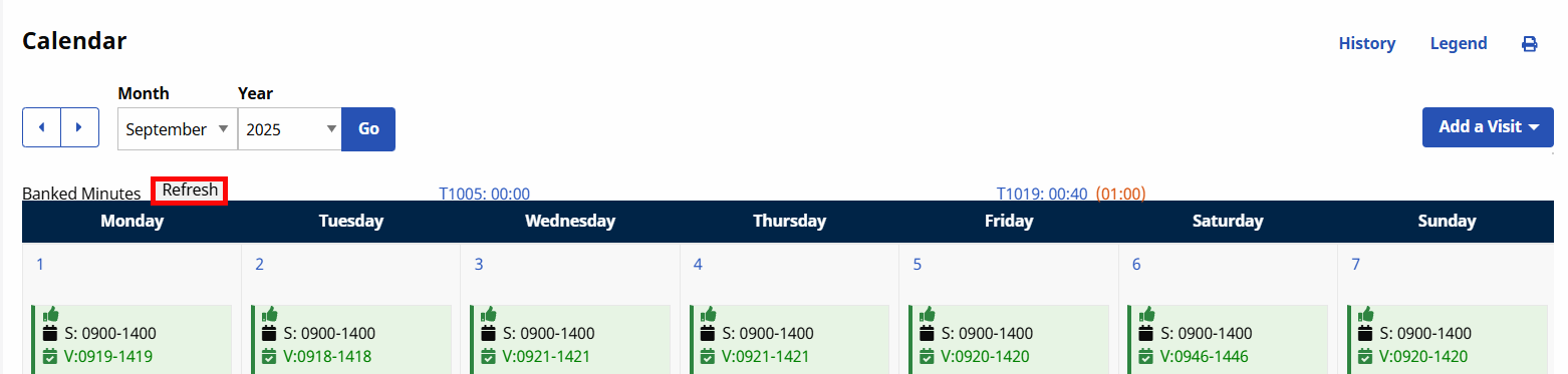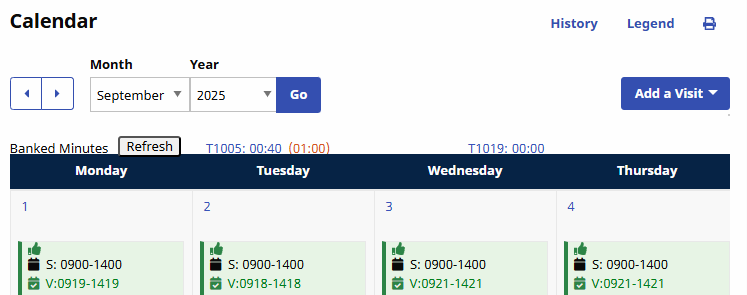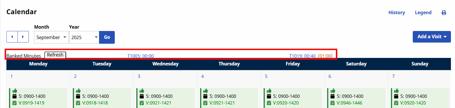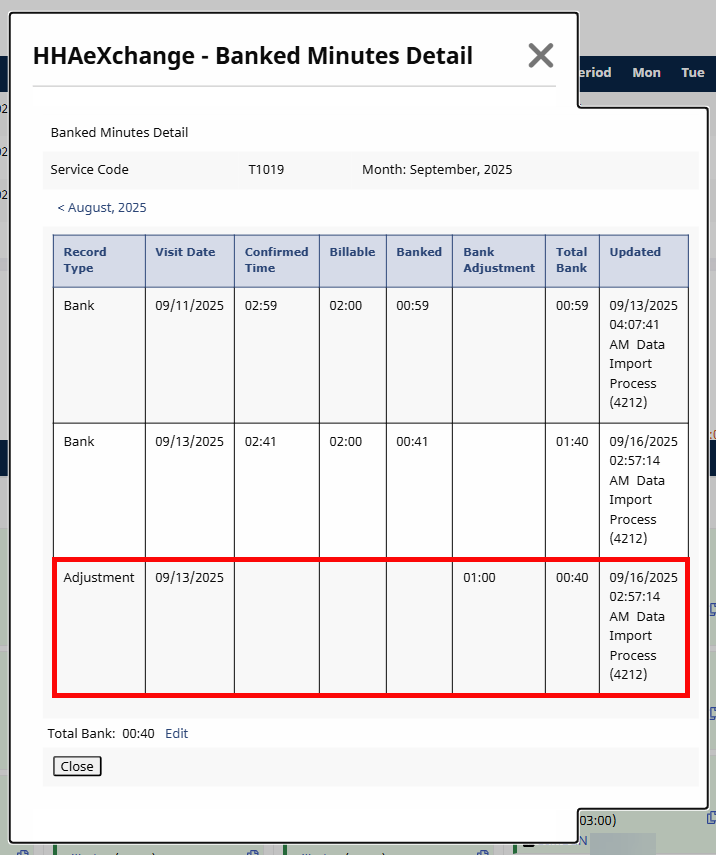 For example, the 9/1 visit is scheduled with T1019 as the Service Code. After the Banked Minutes calculation is applied, 10 minutes are manually adjusted leaving the bank with 1 hour for Service Code T1019.