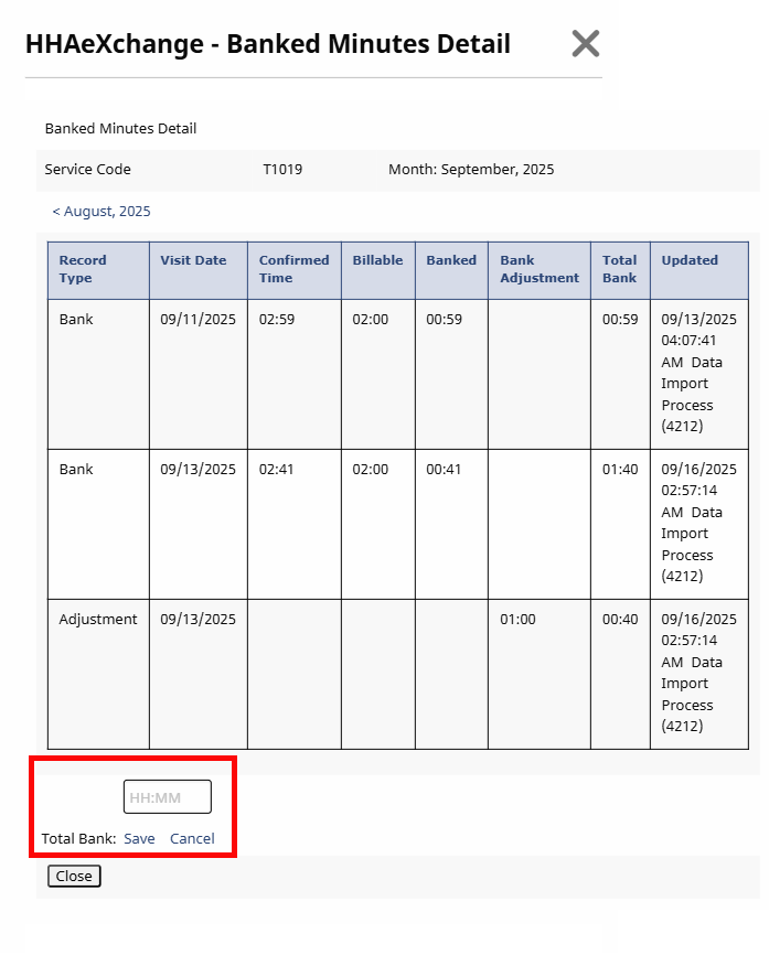 Specifies the total bank balance. The Edit link to the right of the field allows manual adjustments to accommodate changes to confirmation times, deleting a visit, or a Service Code change which may impact the Banked Minutes bank. The Override Banked Minutes permission must be enabled by HHAeXchange System Administration for the role performing this task. |