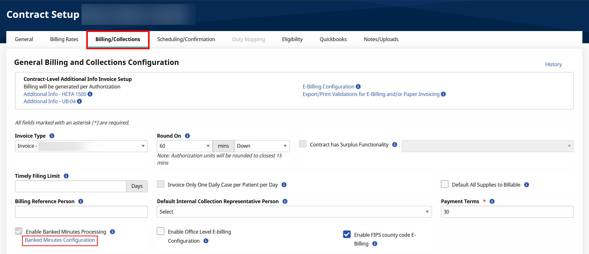 To view specific settings at a Contract level, open the contract via Admin > Contract Setup > Search Contract, click on the Billing/Collections tab, and click the Banked Minutes Configuration link.