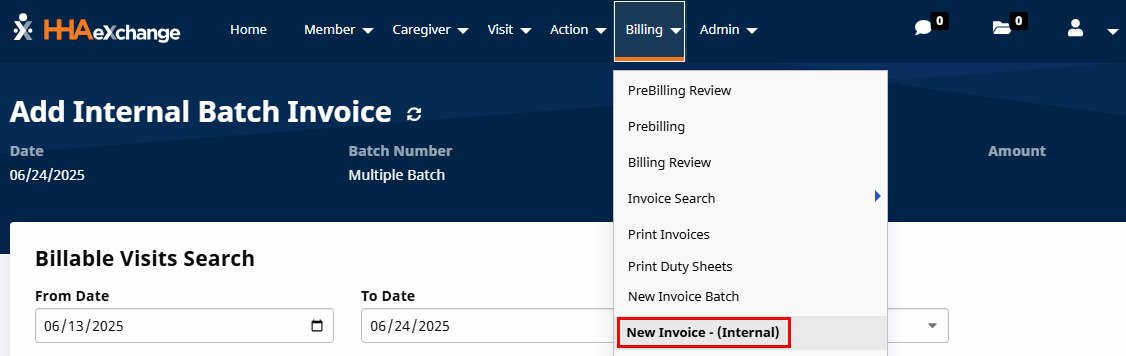 Go to Billing > New Invoice - (Internal) to generate a New Invoice Batch. Use the filters to search for specific visits or click Search to generate all results.