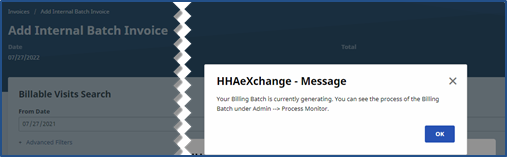 Biller 1 navigates to Billing > New Invoice (Internal) and searches for a specific Contract. Upon selecting visits and clicking on Invoice Batch, the system informs that the Billing Batch is generating.