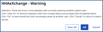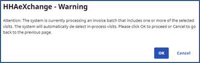 If Biller 1 has already invoiced the selected visits chosen by Biller 2, then Biller 2 receives a validation stating that the applicable visits is automatically deselected.