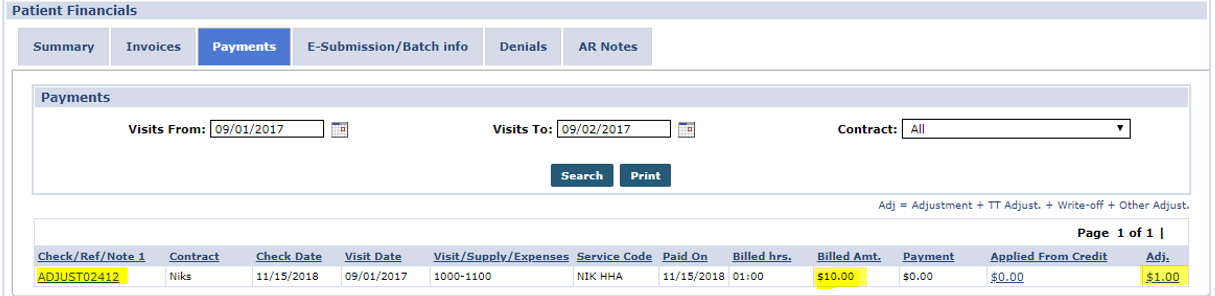 A Primary invoice is created with a 10% adjusted discount or $1.00. Click the Invoice Number link to view the Invoice Details.