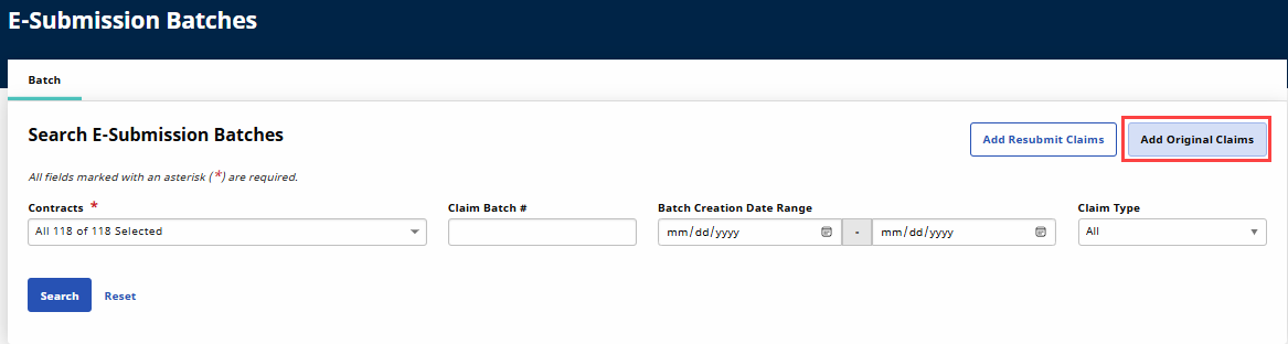 The E-Submission Batches page opens, click the Add Original Claims button to create a new batch.