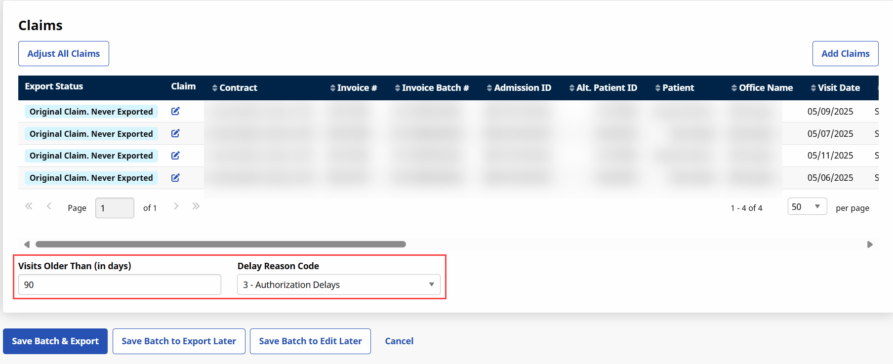 The selected claims appear on the batch page. If any invoiced visits are subject to delayed invoicing, you must select a Delay Reason Code. Visits older than the value in the Visits Older Than field have the selected reason added to the claim file.