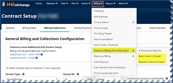 Providers with legacy Linked Contracts can rebill a claim without having to submit a request to the HHAeXchange Support Team; like the existing Rebill functionality for Internal Contracts. Under the Billing tab under Billing > Electronic Billing (Non Silverlight), two menu items exist to support this feature: Batch Search (Linked) and Resubmit Claims (Linked).