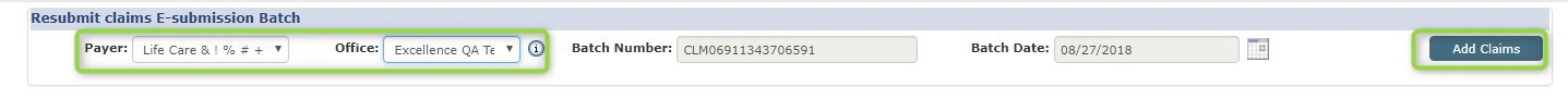 The Office field is also required (based on e-billing configuration). Once both fields are selected the Add Claims button is enabled. Click the Add Claims button to open the Claims Search page.