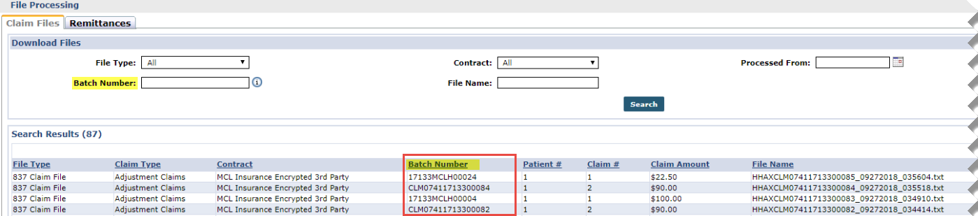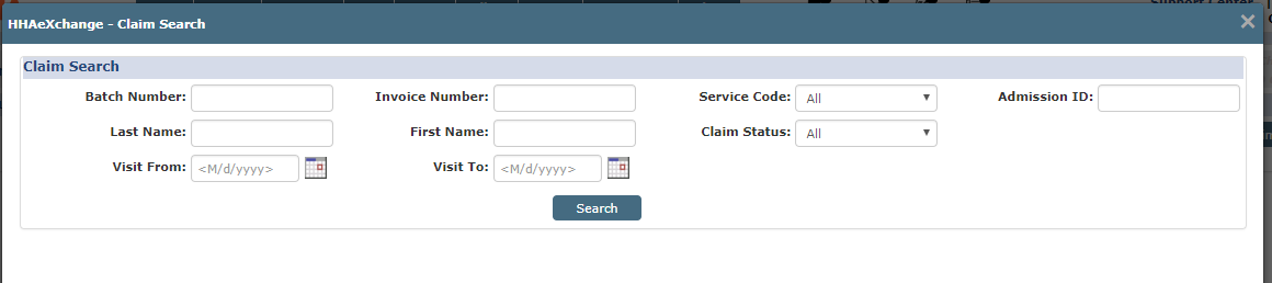 On the Claim Search screen, use the search filters to locate the claim. Searches can be generated by Batch Number, Invoice Number, and Claim Status as well as Visit dates and Patient Name.