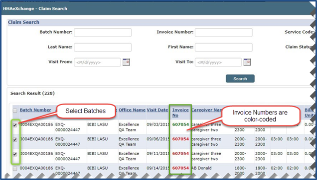 Search results are generated according to the selected search filters. From the search results, batch numbers can be selected using the checkboxes on the left-most column. Invoice Numbers are color-coded as a visual aid.