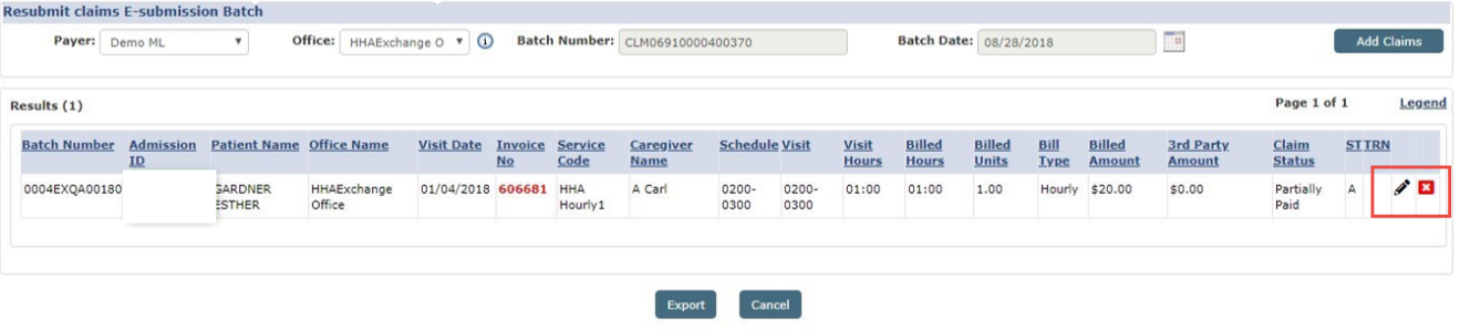 On the Resubmit Claims page, Providers can edit or delete a record. Click the Pencil icon to access the Claim Adjustment screen. Click the Red X icon to remove an individual record from the claim resubmission.