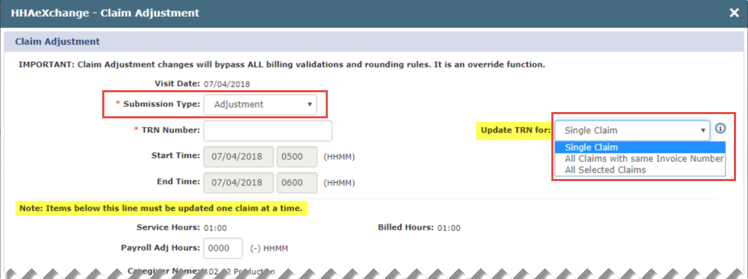 The TRN Number and Update TRNfor fields populate if Adjustment is selected.