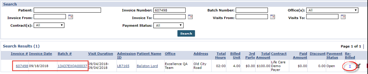 Once a Claim is rebilled, a Y link appears under the Rebilled column. The image below illustrates search results by Invoice under Billing > Invoice Search. Click the Y link to view the rebilling history for the Invoice.