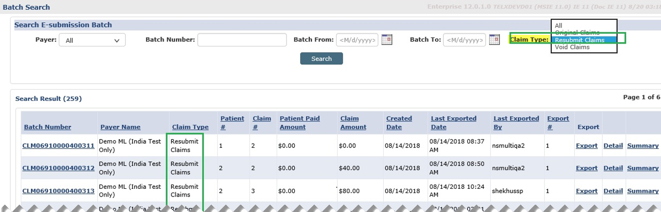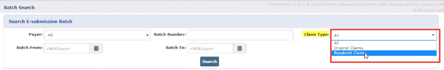 Claim Types include: All, Original Claims, and Resubmit Claims.