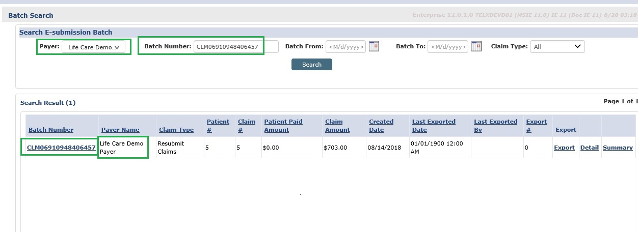 Click the Export and Download button to generate a Resubmit Export Claim. The system generates an 837 which is exported to the Payer and the user has the option to download the file to their local workstation. Once complete, the system routes back to the Batch Search page.