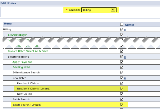 Once the Payer grants permission, go to Admin > User Management > Edit Roles to enable the Resubmit Claims (Linked) and Batch Search (Linked) permissions under the Billing section for the options to be available to an assigned role.