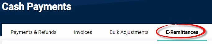 Go to Billing > Cash Payment. Select the E-Remittances tab from the top menu of the page.
