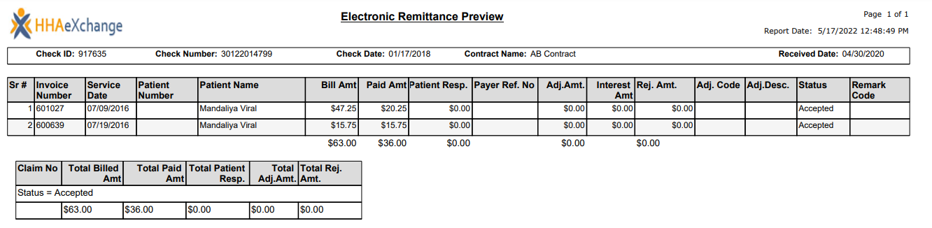 Click the units under Billed Amount or Rejected Amount to download a PDF containing the E-Remittance details. Follow the system prompts to download and open the file.