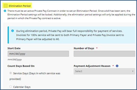 Some Contracts require a Patient to cover 100% of the cost of service for a set number of days before the Payer covers anything. This is referred to as the Elimination Period. Although the Patient is expected to pay the full amount, the Payer must be invoiced for 100% of the service during the Elimination Period.