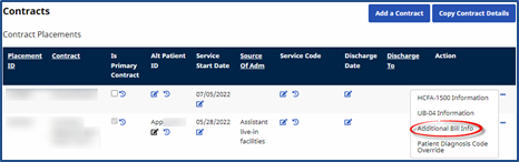 To apply Elimination Period settings, go to the Patient Contract page (Patient > Contract). On the Contract page, click the three-dot icon corresponding to a specific contract, then click Additional Options and select Additional Bill Info from the menu.