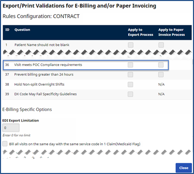 Billing Review validations can be reviewed in the Billing/Collections tab of the Contract Setup page. Click the Export/Print Validations for E-Billing and/or Paper Invoicing link. For example Item 36, Visit meets POC Compliance requirements, controls whether the system applies this validation rule for E-Billing and/or Paper Invoicing.