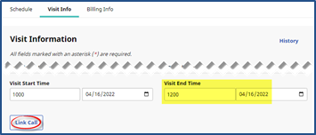 Manually enter a Visit End Timeor Click Link Call button to go to the Call Dashboard and search for a Clock Out EVV which the system did not sync to the visit.