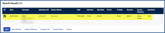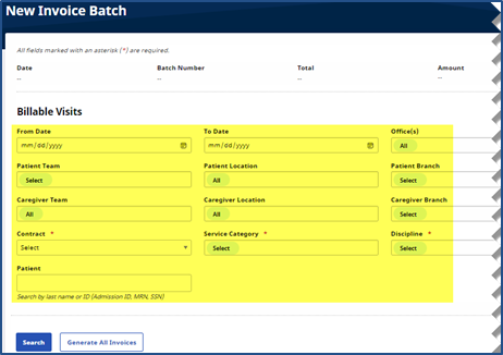 Once selections have been reviewed and finalized, click the Invoice Batch button; OR, click the Generate All Invoices button to prompt the system to invoice every Visit returned in the search results.