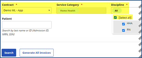 The Service Category field automatically defaults to Home Health, as the category authorized by the Contract. The Discipline field only contains two values: Select All and HHA, or the only Discipline associated with the Service Category Home Health.